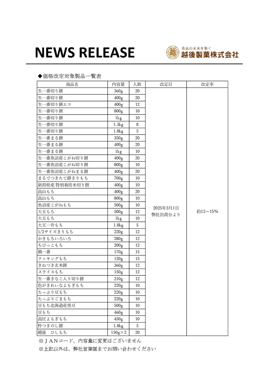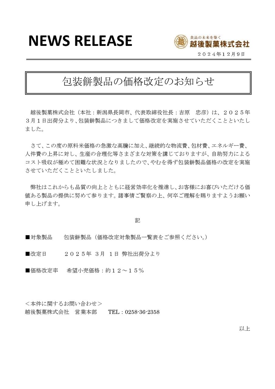 ※『越後製菓』包装餅製品の価格改定については、こちら。