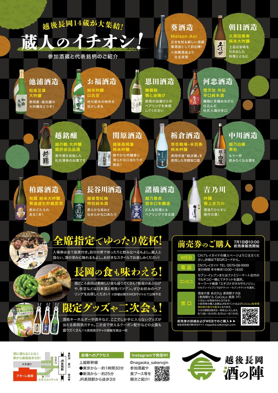 チケット販売所:CNプレイガイド、セブンイレブン、ファミリーマート、酒楽の里 あさひ山 長岡駅ナカ店