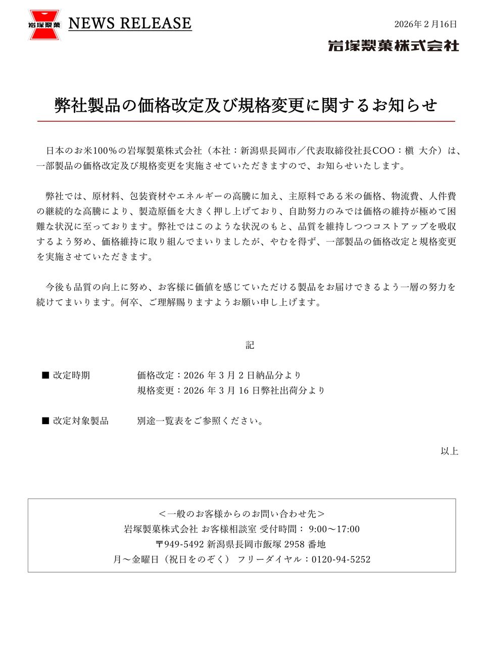 ※『岩塚製菓』の価格改定及び規格変更については、こちら。